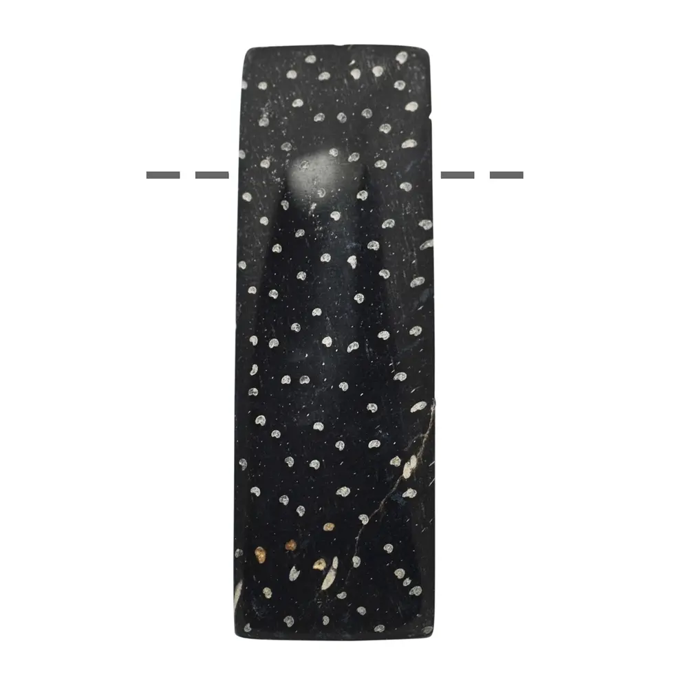 Der Cabochon ist sehr an einem Lederband zu tragen oder - edler - mit einem Wechselbogen aus Silber. Bohrung ca. 2,2mm, Größe des Steins ca. 15 x 30mm Herkunft: Mexiko "In der Steinheilkunde ist Psilomelan von Bedeutung, bei der Verarbeitung von negativen Erfahrungen und um kräftesparend zu handeln."