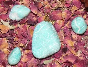Der Amazonit wird dem Sternzeichen Wassermann (21. Januar bis 19. Februar), sowie dem 3. bis 5. Chakra zugeordnet. Die Steine und der Anhänger wurden auf Rosenblättern fotografiert, die man auch als Räuchergabe verwenden kann.