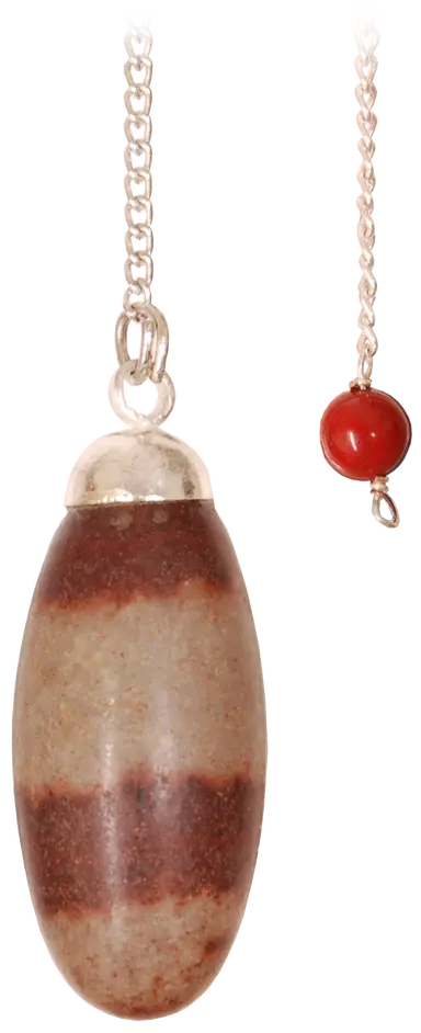 Diese ovalen und geschmeidigen Steine werden ausschließlich im Narmada Fluss in Indien aufgelesen, welcher bereits seit tausenden von Jahren als heilig betrachtet wird. Hier in Form eines Pendels mit versilberter 16cm langer Kette mit Griffkugel