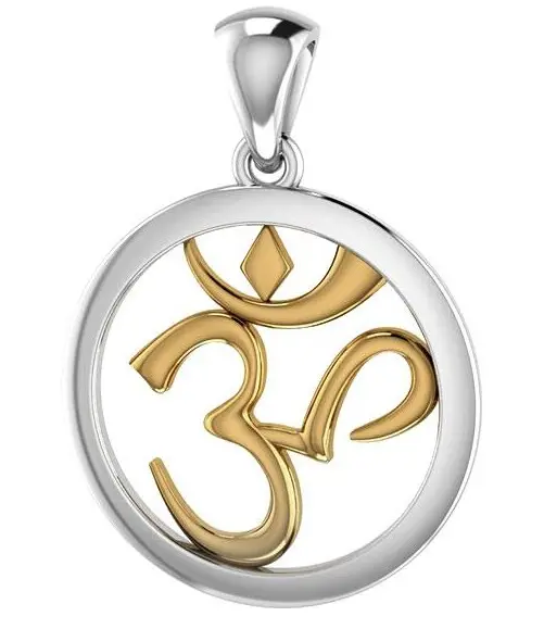 Om-Meditationsanhänger aus Silber und Gold TPV1229 Jedes Mal, wenn wir uns gut fühlen, finden wir eine Schwingungsausrichtung auf das, was wir wirklich sind. Wir kontemplieren und meditieren spirituell. Die Meditationen basieren auf einem Mantra, das im Sanskrit einen Klang symbolisiert – ein Om. Om ist hinduistischen Ursprungs...