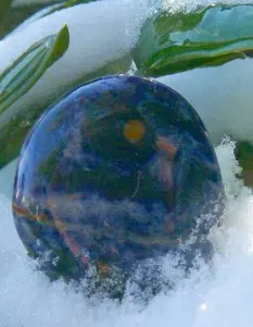 Die Farbe des Sodalith ist ein dunkles, warmes Blau, oft durchbrochen von hellen (fast weißen) oder dunklen (nahezu schwarzen), unregelmäßigen Linien oder fleckenartigen Stellen.