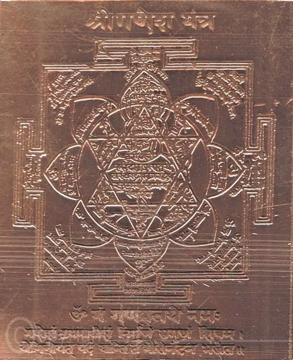 ca. 8 x 10 cm Ganesha Yantra Ist das Leben komplziert, uneffektiv und Probleme scheinbar unlösbar, könnte das Ganesha-Yantra helfen, Hindernisse aus dem Weg zu räumen. Astrologische Bedeutung und Zuordnung: Jungfrau, Merkur https://de.wikipedia.org/wiki/Ganesha Ganesha (Sanskrit गणेश, Gaṇeśa [gʌˈɳeːɕʌ]) (gaṇa: ‚Gefolge‘, ‚Schar‘, īś: ‚Gebieter‘, also „Herr der Scharen"[1]) ist eine der beliebtesten Formen des Göttlichen im Hinduismus. Weitere verbreitete Namen sind unter anderem Ganapati (‚Gebieter der Scharen‘), Vinayaka (‚Entferner [der Hindernisse]‘), Vighnesha (‚Herr der Hindernisse‘), Vigneshvara ("Zerstörer der Hindernisse"), Vighnantaka, Varada ("der Wohltaten Schenkende"), Siddhita ("der, der Erfolg bei der Arbeit schenkt") ......Ganesha wird gefragt, wenn man Glück, Erfolg oder gutes Gelingen für den Weg oder am Anfang einer neuen Unternehmung braucht, beispielsweise für eine Reise, Hochzeit, Hausbau, Geschäftsprüfung, Klausur oder den Beginn eines neuen Tages, er steht für jeden Neuanfang und verkörpert Weisheit und Intelligenz. Zu seinen Angelegenheiten gehören die Poesie, Musik, Tanz, Schrift und Literatur, und er ist der Herr über die Wissenschaften und Gott des Handels. Die meisten Kaufleute betrachten ihn als ihren Schutzherrn und in fast jedem Laden ist eine Ganeshastatue zu finden. Für viele fromme Hindus ist das erste, was in ein neues Haus kommt, eine Statue des Ganesha. Diese segnet das Haus und verheißt Glück. Er ist auch auf fast jeder Hochzeitseinladungskarte zu finden. ...Rätselhaft erscheint Ganeshas Mischform aus Mensch und Elefant. ...Ganesha ist der Gott und "Herr der Hindernisse", sowohl der Beseitiger als auch der Setzer von Hindernissen, wenn sich jemand ihm gegenüber respektlos verhält oder diese für ihn notwendig sind. ...Für jene Gläubigen, die in Ganesha oder Ganapati das Höchste sehen, ist Ganesh Chaturthi (nach dem Mondkalender zwischen Mitte August und Mitte September) das höchste aller Feste im Jahreslauf; Ganesha Yantra aus Kupfer