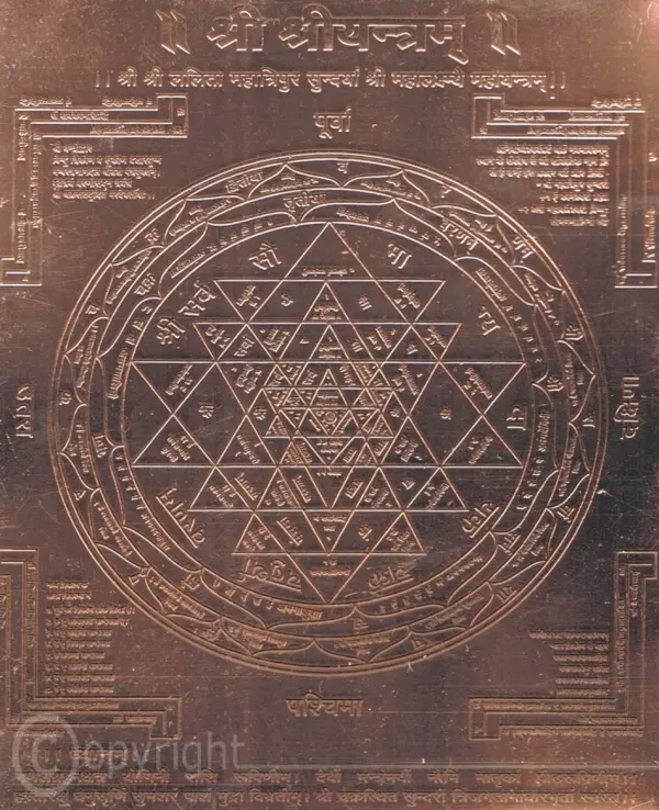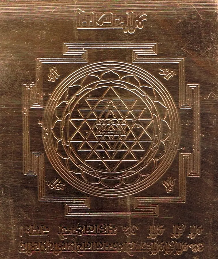 ca. 12 x 15 cm Shri-Yantra aus Kupfer Das Shri-Yantra als Sinnbild der kosmischen Schöpferkraft schwingt in allem und durch alles. Es durchdringt die verschiedenen Seins-Ebenen, harmonisiert und inspiriert. Astrologische Zuordnung und Bedeutung: galaktisches Zentrum, Ketu, Sternzeichen Schütze